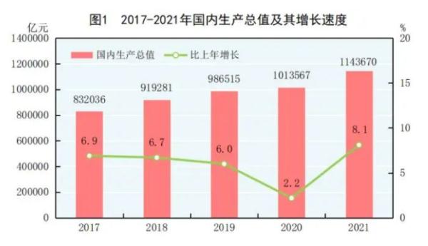 2021年,我國國內(nèi)生產(chǎn)總值(GDP)比上年增長8.1%,兩年平均增長5.1%,在全球主要經(jīng)濟(jì)體中名列前茅;經(jīng)濟(jì)規(guī)模突破110萬億元,達(dá)到114.4萬億元,穩(wěn)居全球第二大經(jīng)濟(jì)體。