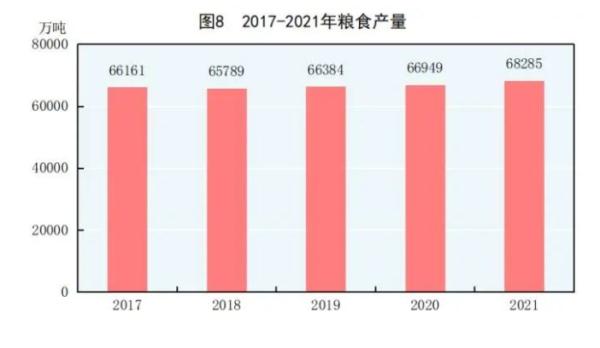 糧食生產(chǎn)再獲豐收。2021年糧食總產(chǎn)量13657億斤,比上年增產(chǎn)267億斤,增長2.0%,再創(chuàng)歷史新高。
