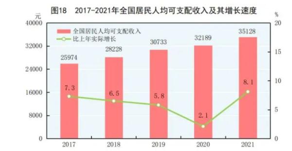 居民收入與經(jīng)濟(jì)增長基本同步。2021年全國居民人均可支配收入35128元,比上年實(shí)際增長8.1%,快于人均GDP增速,與GDP增速同步。