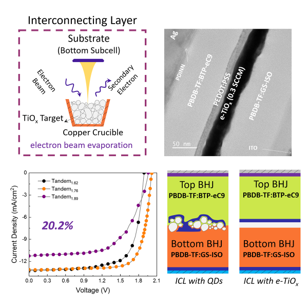 近期,中國科學院化學研究所高分子物理與化學實驗室研究員侯劍輝課題組發現,在電子束蒸發二氧化鈦的過程中,金紅石相的二氧化鈦可轉化為非晶態薄膜。該薄膜不僅均勻致密,還具有較好的耐酸性。因此,聚(3,4-乙烯二氧噻吩):聚苯乙烯磺酸(PEDOT:PSS)可通過溶液法在其表面形成光滑、致密的薄膜。進一步,課題組通過精確控制補氧速率,有效調節了沉積物的化學組成、電子能級、相對介電常數和摻雜密度。在最佳條件下,基于e-TiO1.76//PEDOT:PSS隧道結的疊層有機太陽能電池的光伏效率超過了20%。