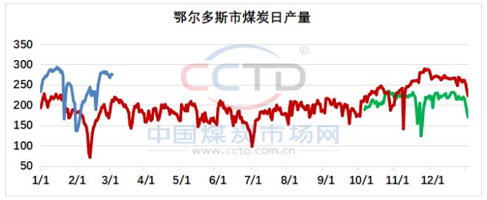 國內(nèi)產(chǎn)地供煤穩(wěn)步回升。根據(jù)CCTD中國煤炭市場網(wǎng)監(jiān)測的數(shù)據(jù)顯示,3月3日當(dāng)周,鄂爾多斯日均產(chǎn)量275.1萬噸/日,周環(huán)比增加9.5萬噸/日,同比大幅增加88.4萬噸/日。全國煤炭產(chǎn)量恢復(fù)至1200萬噸以上,基本恢復(fù)至節(jié)前高位水平。此外近期發(fā)運利潤好轉(zhuǎn),產(chǎn)地至港口發(fā)運也明顯改善。大秦線發(fā)運已提升至130萬噸/日滿發(fā)狀態(tài),呼局也保持近250萬噸周度發(fā)運量,均接近去年四季度高位水平。