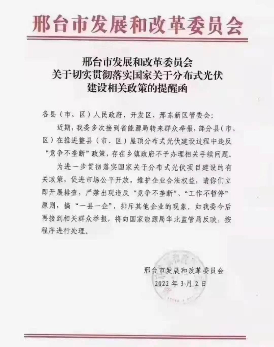 主管部門領導言猶在耳,地方政府表現如何?從目前情況看,只有部分地區能將“五不”原則落實到位。一個典型案例是,河北邢臺市發改委近日印發《關于切實貫徹落實國家關于分布式光伏建設相關政策的提醒函》,要求各區縣即開展排查,嚴禁出現違反“競爭不壟斷”、“工作不暫停”原則,搞“一縣一企”、排斥其他企業的現象。如市發改委今后再接到相關群眾舉報,將向國家能源局華北監管局反映,按程序進行處理。不知道,有多少地區能像邢臺一樣,落實好國家相關政策,讓當地百姓得到最大的實惠?