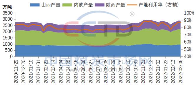國(guó)內(nèi)產(chǎn)地產(chǎn)銷保持高位。根據(jù)CCTD中國(guó)煤炭市場(chǎng)網(wǎng)監(jiān)測(cè)的數(shù)據(jù)顯示,3月6日當(dāng)周,晉陜蒙442家煤礦產(chǎn)量合計(jì)2886萬(wàn)噸,產(chǎn)能利用率86.9%,產(chǎn)量環(huán)比基本持平,同比增長(zhǎng)6.6%。陜西、山西周產(chǎn)量均創(chuàng)今年新高。本周下游拉運(yùn)也較為積極,同時(shí)由于疫情管控加嚴(yán),運(yùn)費(fèi)上漲。榆林地區(qū)在產(chǎn)煤礦整體銷售情況良好,基本保持產(chǎn)銷平衡狀態(tài);受產(chǎn)地發(fā)運(yùn)至港口利潤(rùn)較好影響,鄂爾多斯地區(qū)煤炭銷售發(fā)運(yùn)積極。