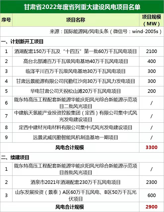 國際能源網/風電頭條(微信號:wind-2005s)通過梳理,甘肅省2022年重點建設風電項目共計12個,規模總計6200MW,其中包含4個風光項目。