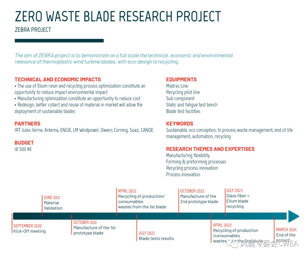 ZEBRA零廢葉片研究項目于 2020 年 9 月正式啟動,由法國凡爾納國際研究中心(IRT Jules Verne)領(lǐng)導(dǎo)發(fā)起,這家獨特的合作伙伴組織匯集了包括阿科瑪、CANOE、Engie、LM Wind Power、歐文斯科寧和 SUEZ 在內(nèi)的多家工業(yè)公司。項目預(yù)算超過1850萬歐元。
