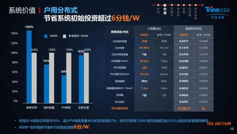 此外,經過全方位實證案例及第三方測試,600W+組件在分布式的應用價值十分顯著。600W+組件在戶用租賃模式下,典型常見屋頂可以節省系統初始投資超過6分錢/W,而且由于組件功率提升,安裝塊數減少,在新一代超高功率組件中系統價值全面勝出。