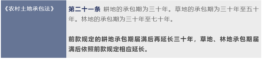 第二輪土地承包即將到期,《民法典》《土地管理法》和《農村土地承包法》均對土地承包續期問題作出了規定,具體情況如下表:
