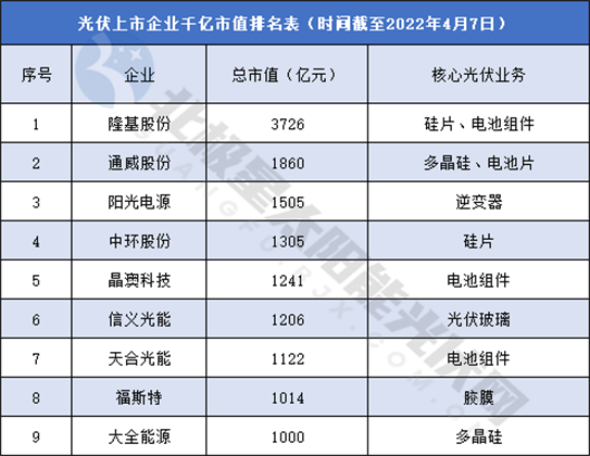 光伏企業爭相上市的背后,是企業市值蓬勃增長的速度和千億市值身家的“誘惑”。據北極星太陽能光伏網統計,截至4月7日收盤,共有9家企業市值突破1000億元,詳情如下: