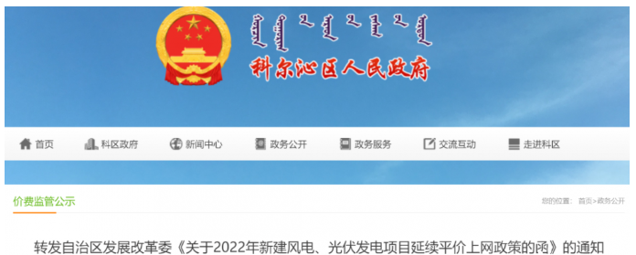 4月18日,科爾沁人民政府轉發由國家發改委發布的《關于2022年新建風電、光伏發電項目延續平價上網政策的函》的通知。
