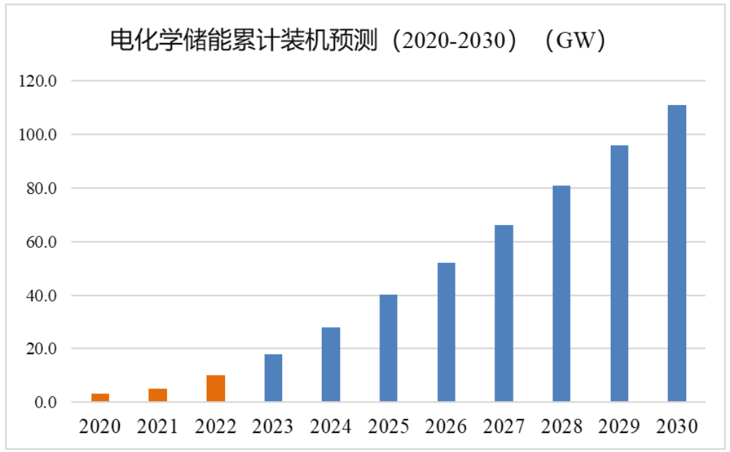 該報告從國網和南網的新型電力系統建設目標(2021-2030年)情況進行了分析預測,在新型儲能方面,預計到2025年,我國新型儲能裝機規模將突破5000萬千瓦。但是,考慮到新型儲能安全性問題、儲能價格機制滯后性、新型儲能原材料緊缺等方面的現實情況,電化學儲能電站裝機規模大概率會存在一定滯后性。到2025年,電化學儲能累計裝機或將40GW,鋰離子電池仍然占據新型儲能應用技術優勢;2025年后,考慮到2030年實現碳達峰的宏偉目標,新能源發電年裝機量將保持年均100GW增量,電化學儲能的年裝機增量將保持在12-15GW,預計到2030年,電化學儲能裝機規模將達到約110GW。