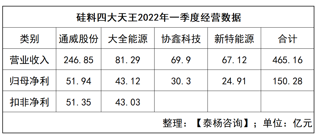 近日硅料“四大天王”通威股份、協鑫科技、大全能源、新特能源陸續公布2022年第一季度年度報告,利潤超預期,用實力告訴我們“擁硅為王”。