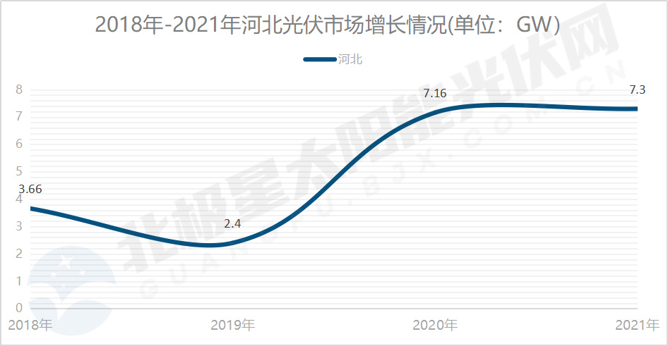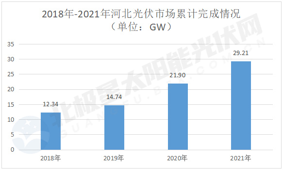 河北省光伏資源豐富,已成為光伏發(fā)展的重點省份之一。據國家能源局統(tǒng)計數據顯示,2018年,光伏累計裝機達到12.34GW;2020年21.9GW,2021年29.21GW,3年增長1.37倍。目前,河北光伏裝機總容量僅次于山東。