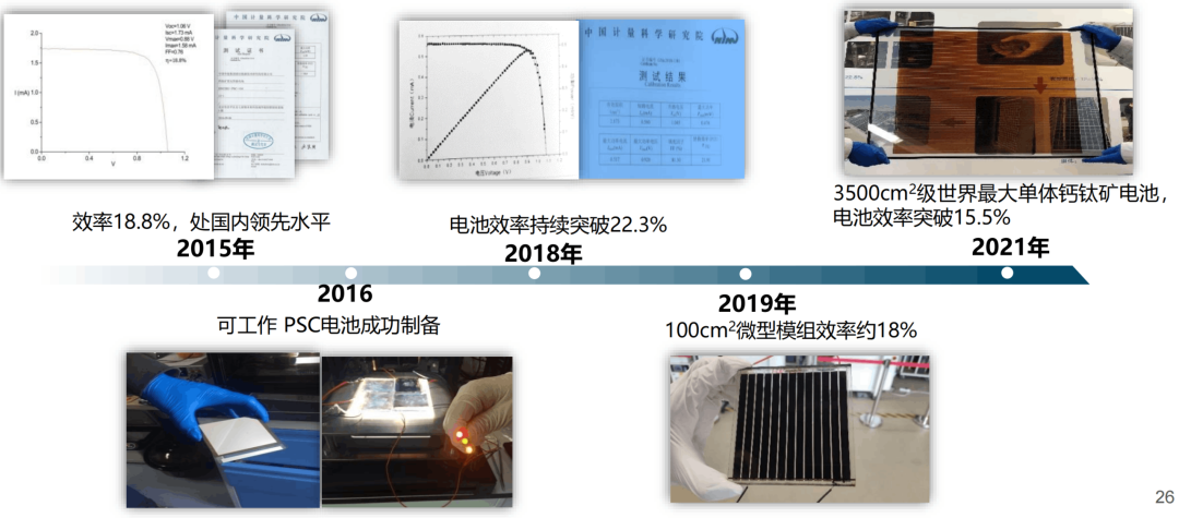 2021年極電光能20.1%@64cm²鈣鈦礦組件穩態效率被《Solar Cell efficiency Tables》認定為鈣鈦礦光伏組件世界最高效率,被Martin Green教授評價為“里程碑”式的成果。近日,300cm²的大組件效率經中國計量科學研究院認證達到18.2%,創造了新的世界紀錄。