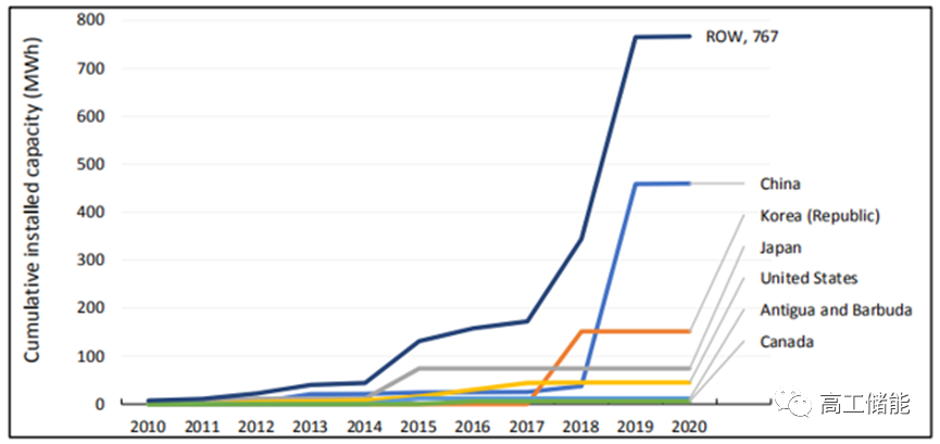 2010-2020年全球液流電池裝機量增長情況(MWh)