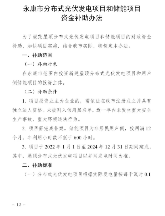 值得注意的是,文件同時還明確:實施財政補助,設立專項資金,對2022年1月1日至2024年12月31日期間建成的屋頂分布式光伏發電項目、非居民用戶側儲能項目給予財政補助。其中,新建屋頂分布式光伏發電項目根據實際發電量按每千瓦時0.1元給予補助,連續補3年(與金華補助標準一致),一年發放一次;對非居民用戶側儲能項目(年利用小時數不低于600小時),按照儲能設施的功率給予補助,補助標準按150元、120元、100元/千瓦逐年退坡(省補助標準:調峰項目按200元、180元、170元/千瓦退坡,補助期三年),已享受省級補助的項目不再重復補助。