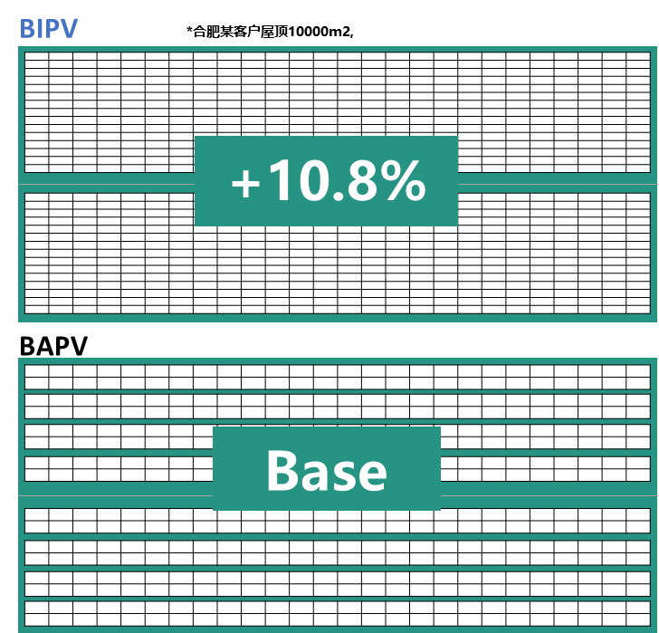 合肥某客戶屋頂10000m²屋頂面積進(jìn)行實(shí)際測(cè)算分析發(fā)現(xiàn),考慮屋面實(shí)際情況和排布,BIPV無(wú)需預(yù)留運(yùn)維通道,同等面積下比BAPV裝機(jī)容量增加10.8%,