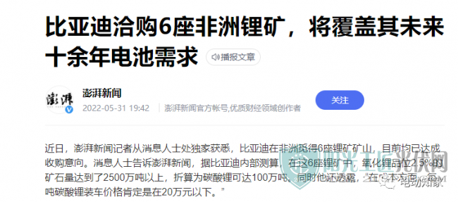 據澎湃新聞報道,比亞迪在非洲覓得6座鋰礦礦山,目前均已達成收購意向。據比亞迪內部測算,在這6座鋰礦中,氧化鋰品位2.5%的礦石量達到了2500萬噸以上,折算為碳酸鋰可達100萬噸。同時消息人士還透露,“在成本方面,每噸碳酸鋰裝車價格肯定是在20萬元以下。”這2500萬噸礦石若被全部開采,可以滿足2778萬輛60度純電車型的動力電池需求,比亞迪2022年銷量目標為150萬輛,若以此計算,拿下的這些鋰礦石,意味著比亞迪未來十余年都夠用了。目前比亞迪方面還沒有回應。