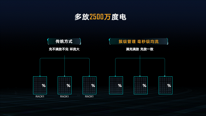 其次,眾所周知,一套儲能系統中涉及電芯的數量高達上千個,“木桶效應”意味著在整套儲能系統中,最差的電芯決定了整個系統的充放電效率。在陽光電源液冷儲能系統中,采用了簇級管理的方案,通過毫秒級的智能調節每一簇的充放電進而解決了木桶效應,這意味著100MWh電站全生命周期可以多放2500萬度電。