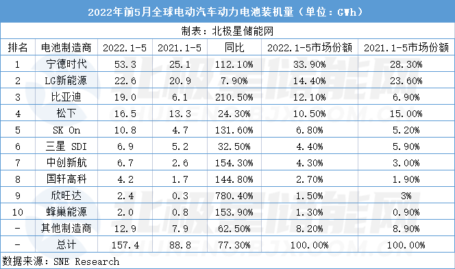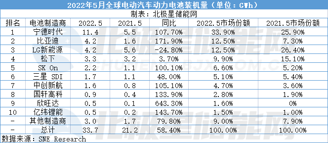 北極星儲能網獲悉,7月4日,韓國市場研究機構SNE Research公布數據,2022年5月,全球電動汽車電池裝機量達33.7GWh,同比增長58.4%,連續23個月保持穩定增長。