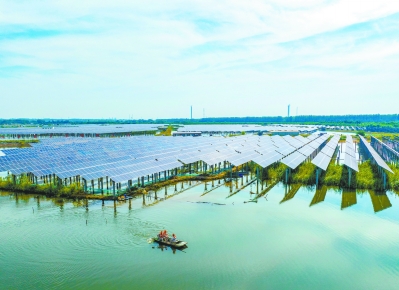 近年來,南京市積極發展太陽能、風能等清潔綠色能源,新能源項目及時并網,地區清潔能源100%消納。到目前為止,新能源裝機總容量突破100萬千瓦,有效助力“雙碳”目標的實現。圖為六合龍袍通威“漁光一體”現代產業園的水上光伏電站。