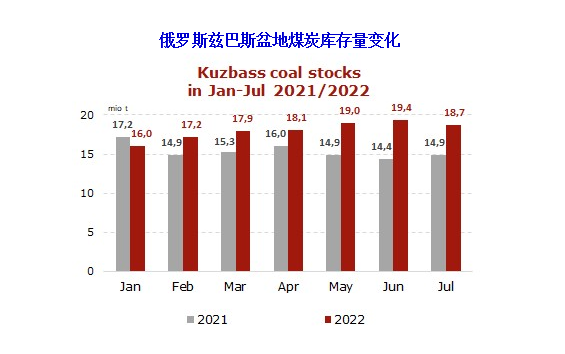 由于鐵路物流問題和國際社會對俄羅斯的制裁,庫茲巴斯的庫存連續第六個月同比增長。截至2022年8月1日,庫茲巴斯煤炭庫存總量為1870萬噸,比上年同期增加380萬噸,同比增長25.5%。