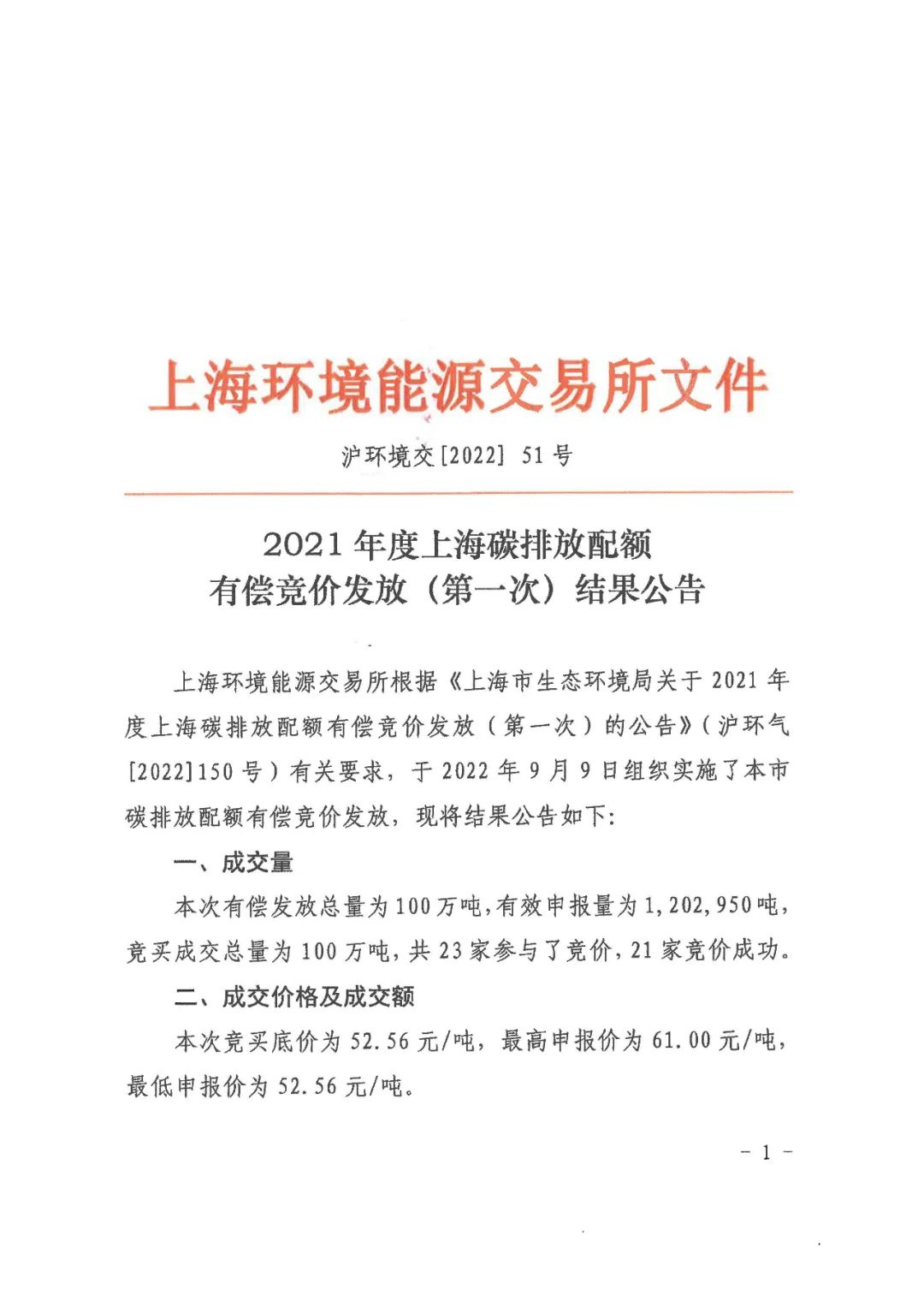 9月9日,上海環境能源交易所公布了2021年度上海碳排放配額有償競價發放(第一次)結果,數據顯示,共23家參與了競價、21家競價成功。競買底價為52.56元/噸,最高申報價為61.00元/噸,統一成交價為52.56元/噸,總成交金額為5256萬元。