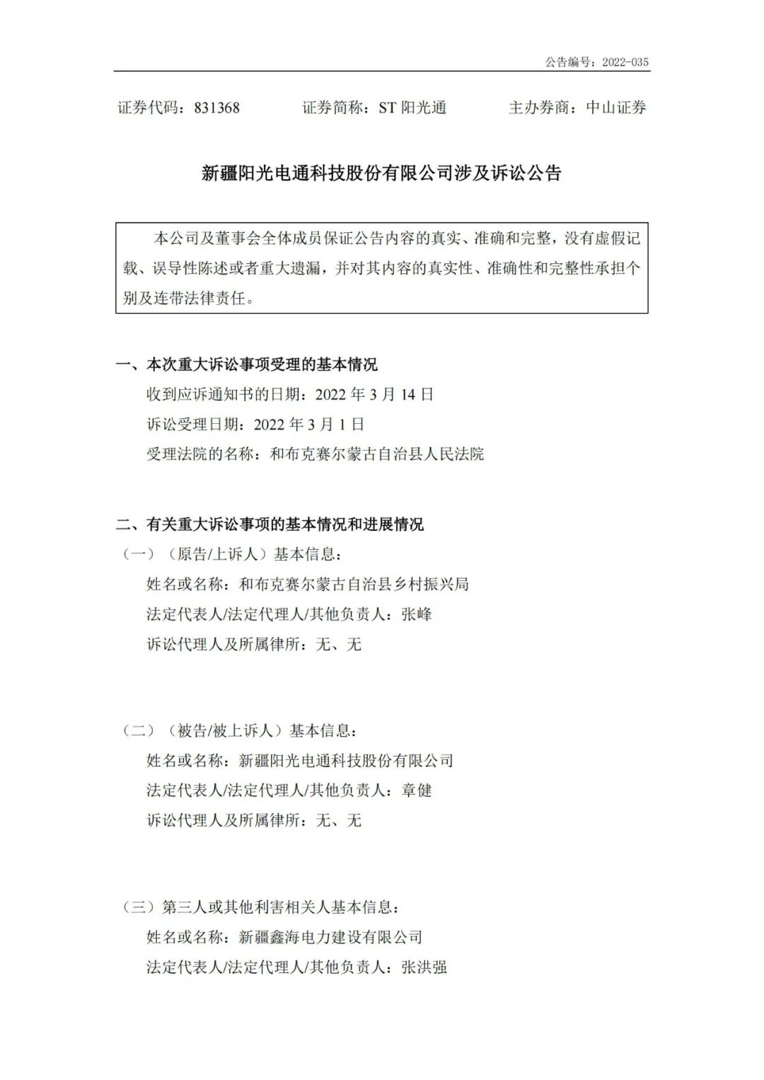 9月14日,新疆陽光電通科技股份有限公司(證券簡稱“ST陽光通”)發布訴訟公告,該訴訟案件原告為和布克賽爾蒙古自治縣鄉村振興局,被告為ST陽光通,第三人或其他利害相關人新疆鑫海電力建設有限公司。