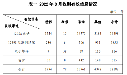 2022年8月,國家能源局12398能源監(jiān)管熱線(以下簡稱12398熱線)共收到有效信息22182件(包含投訴、舉報、咨詢和其他訴求類別),環(huán)比增加18.10%,同比增加77.67%。(2022年8月收到有效信息情況見表一)
