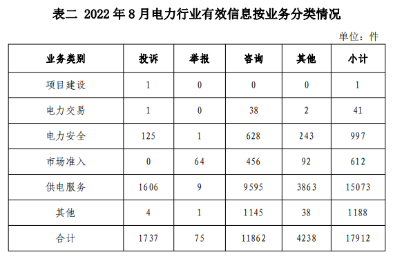 電力行業(yè)排在首位,有效信息數(shù)量為17912件,占全部有效信息的80.75%。群眾關(guān)注的內(nèi)容主要集中在供電服務(wù)、電力安全、市場準入等方面。(2022年8月電力行業(yè)有效信息按業(yè)務(wù)分類情況見表二)