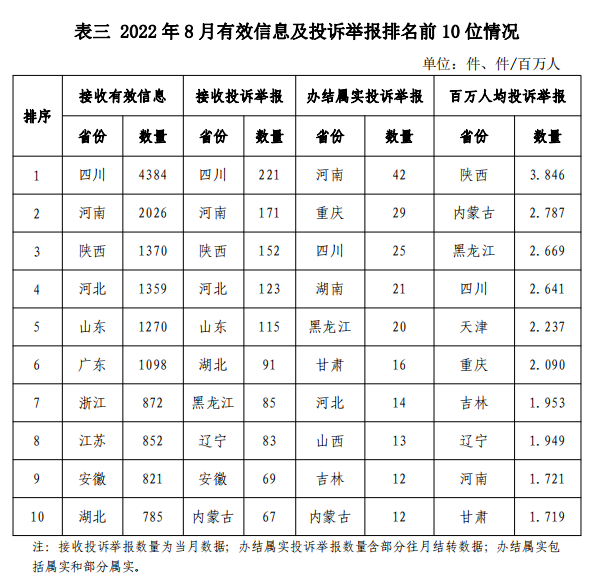各省(自治區(qū)、直轄市)按照接收的有效信息數(shù)量排序,四川、河南、陜西、河北、山東、廣東、浙江、江蘇、安徽、湖北排在全國前10位;按照接收的投訴舉報數(shù)量排序,四川、河南、陜西、河北、山東、湖北、黑龍江、遼寧、安徽、內(nèi)蒙古排在全國前10位;按照辦結(jié)屬實的投訴舉報數(shù)量排序,河南、重慶、四川、湖南、黑龍江、甘肅、河北、山西、吉林、內(nèi)蒙古排在全國前10位;按照百萬人均投訴舉報數(shù)量排序,陜西、內(nèi)蒙古、黑龍江、四川、天津、重慶、吉林、遼寧、河南、甘肅排在全國前10位。(2022年8月有效信息及投訴舉報排名前10位情況見表三)