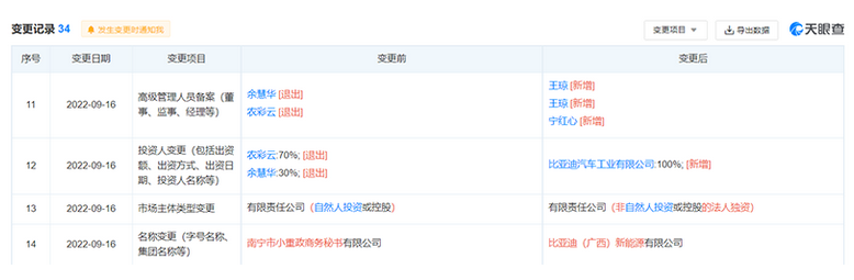 9月16日,小重政商務(wù)的融資動(dòng)態(tài)顯示,小重政商務(wù)近日發(fā)生工商變更,原股東均退出,新增全資股東比亞迪汽車工業(yè),并更名為“比亞迪新能源”。