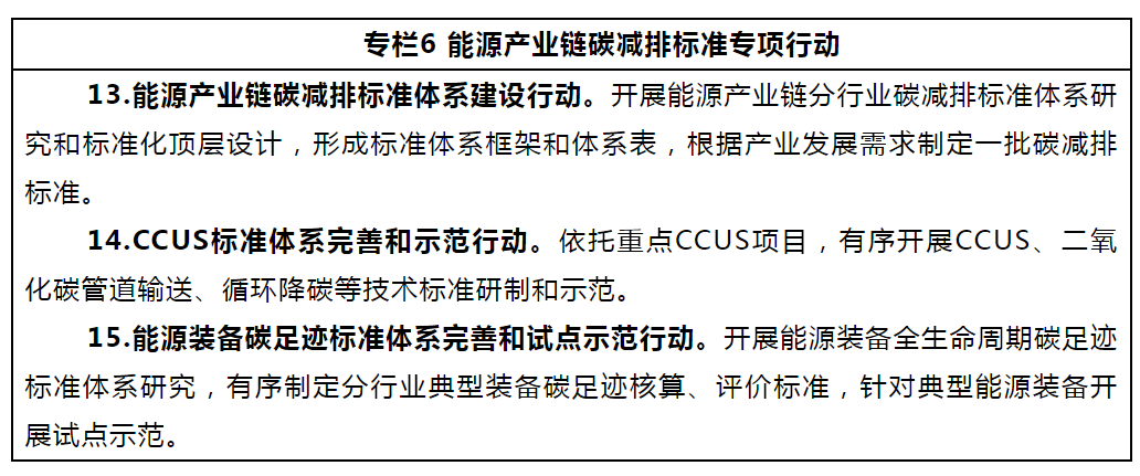圍繞能源領(lǐng)域二氧化碳捕集利用與封存(CCUS)有關(guān)技術(shù)研發(fā)和項目建設(shè)需求,加快推進(jìn)相關(guān)標(biāo)準(zhǔn)管理體系和標(biāo)準(zhǔn)體系完善,推進(jìn)二氧化碳捕集、輸送、封存監(jiān)測、泄漏預(yù)警、驅(qū)油等關(guān)鍵環(huán)節(jié)標(biāo)準(zhǔn)制修訂。