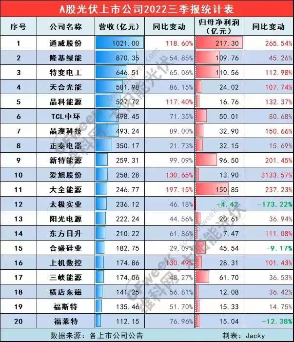 細分光伏產(chǎn)業(yè)鏈各環(huán)節(jié)看,以通威為代表的硅料企業(yè)不管是在營收還是在凈利潤上都成為前三季的大贏家。