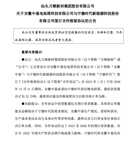 協議內容為:在2023年1月1日至2026年12月31日期間,安徽中基承諾向寧德時代供應鋰電鋁箔,最低供貨量合計為32萬噸,最終供應量及價格按后續具體訂單為準。