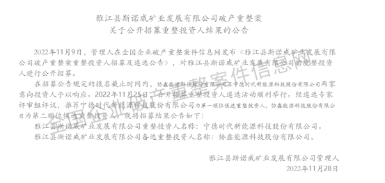 對此,寧德時代11月28日回應(yīng)稱,公司通過線下綜合評分流程,于當(dāng)天成為斯諾威公司重整投資人。此舉將有利于公司對上游主要資源進行全面布局,進一步增強供應(yīng)鏈保障能力,完善產(chǎn)業(yè)鏈的戰(zhàn)略布局。