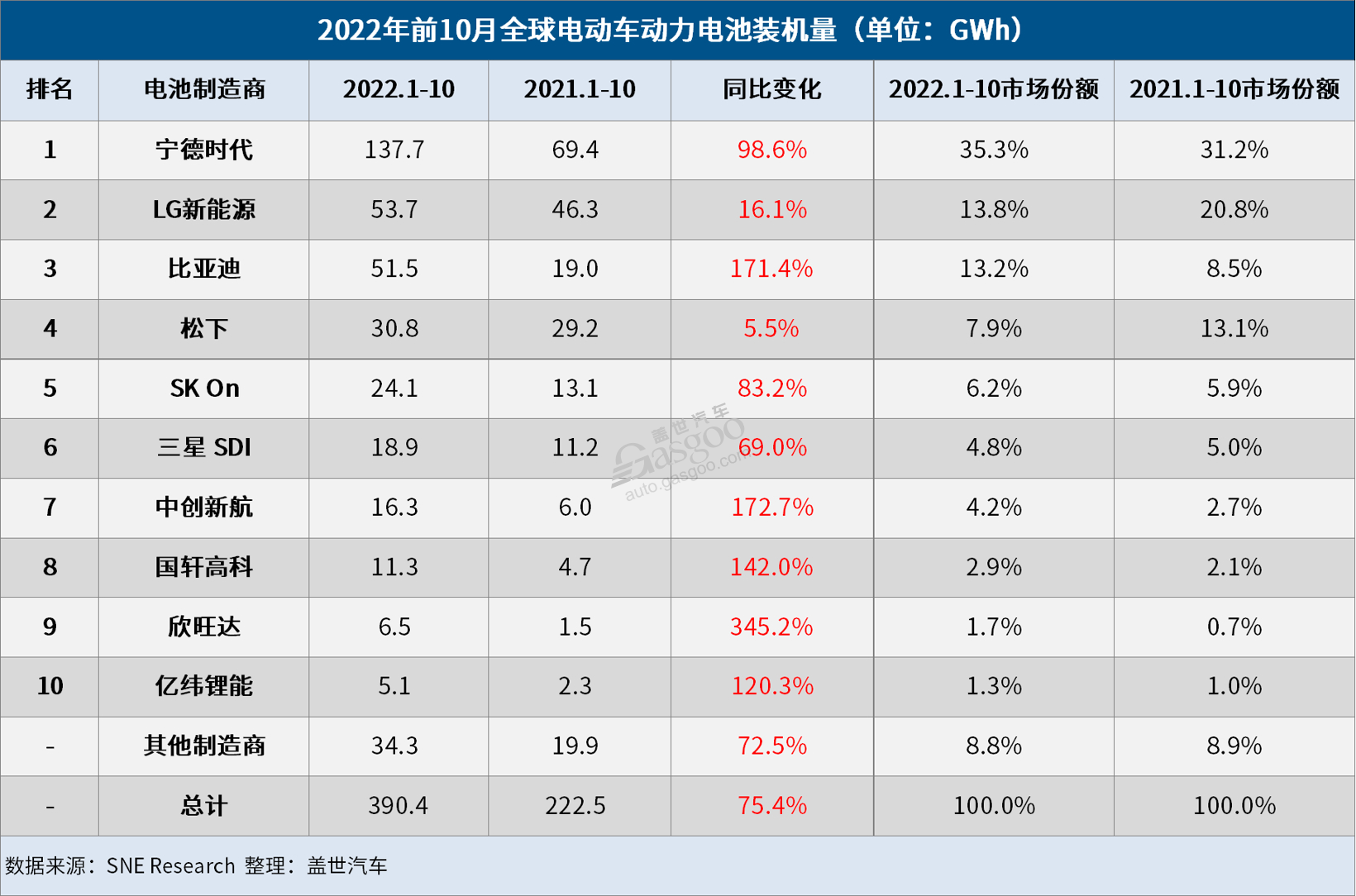國軒高科、欣旺達和億緯鋰能位列第8至10名。其中國軒高科裝機量增長100.4%,市場份額增至3%;億緯鋰能將蜂巢能源擠出榜單,時隔三個月重回榜單第10名。