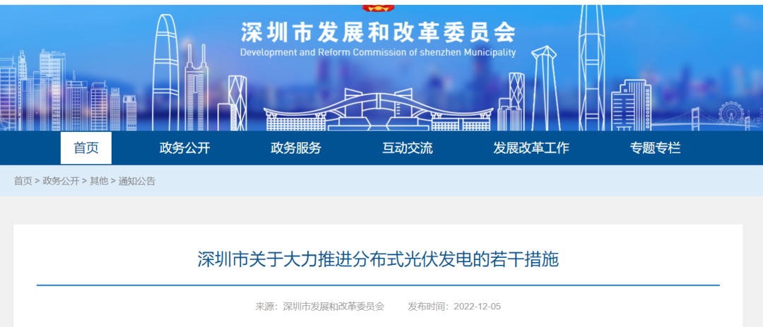 近日【光伏資訊】微信公眾號(PV-info)了解到,12月5日,深圳市發(fā)改委發(fā)布《深圳市關(guān)于大力推進(jìn)分布式光伏發(fā)電的若干措施》,措施提出,充分利用工業(yè)園區(qū)、企業(yè)廠房、物流倉儲基地、公共建筑、交通設(shè)施和居民住宅等建筑物屋頂、外立面或其他適宜場地,按照“宜建盡建”原則積極開展光伏項(xiàng)目建設(shè),大力推廣建筑光伏一體化(BIPV),力爭“十四五”期間全市新增光伏裝機(jī)容量150萬千瓦。重點(diǎn)推動工業(yè)園區(qū)規(guī)模化布局光伏項(xiàng)目,引導(dǎo)大型企業(yè)集團(tuán)積極開展光伏項(xiàng)目建設(shè),支持國有企業(yè)規(guī)模化建設(shè)光伏項(xiàng)目。