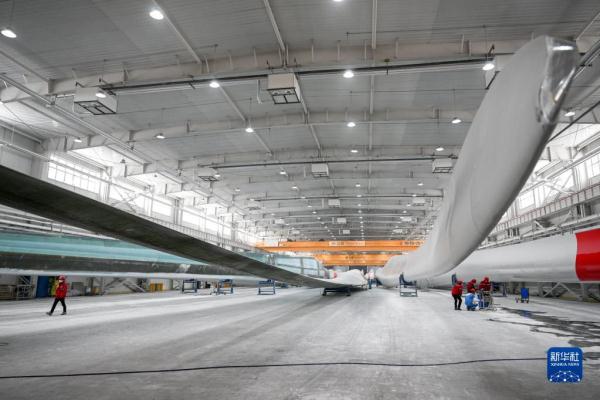 2月9日,在內(nèi)蒙古烏蘭察布市遠(yuǎn)景北方能源有限公司,質(zhì)檢員在風(fēng)機(jī)葉片生產(chǎn)線上工作。