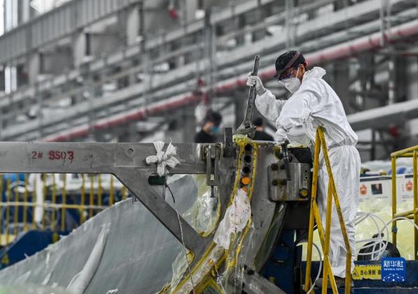 2月9日,在內(nèi)蒙古烏蘭察布市遠(yuǎn)景北方能源有限公司,工人在風(fēng)機(jī)葉片生產(chǎn)線上工作。