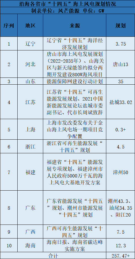 風芒能源根據公開信息不完全統計,目前已出爐的沿海省市海上風電規劃超250GW。
