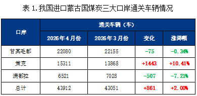 4月份進(jìn)口蒙古國煤炭三大口岸總通關(guān)量保持增長態(tài)勢,各口岸呈現(xiàn)小幅分化。
