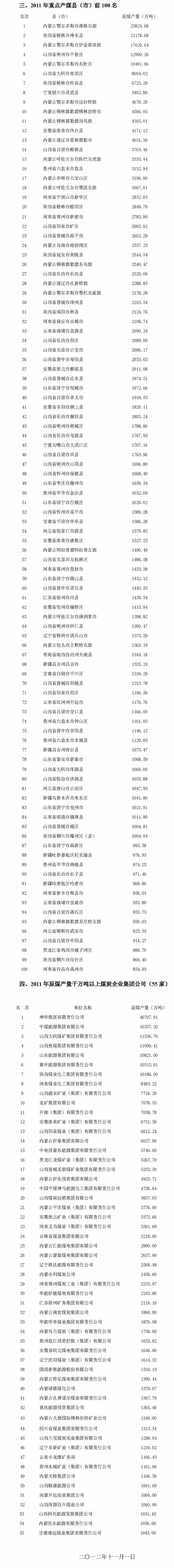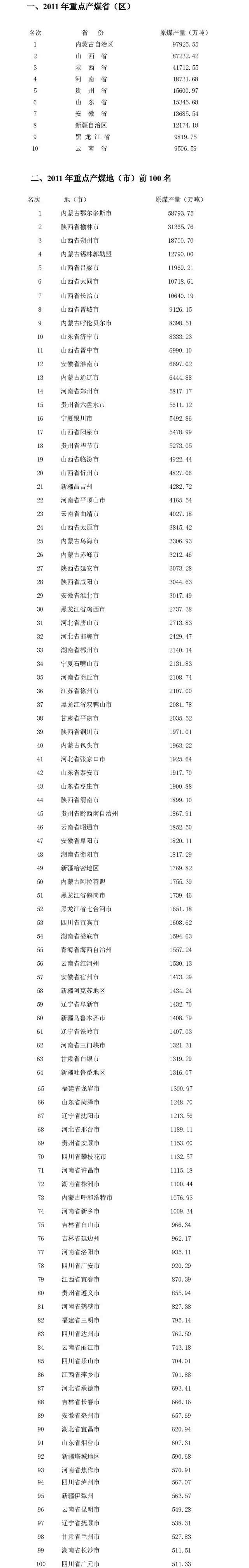 中國煤炭工業協會統計與信息部對2011年度直報統計數據進行了整理,現將全國重點產煤省(區)、重點產煤地(市)縣、千萬噸以上煤炭企業集團產量統計排序公布如下: