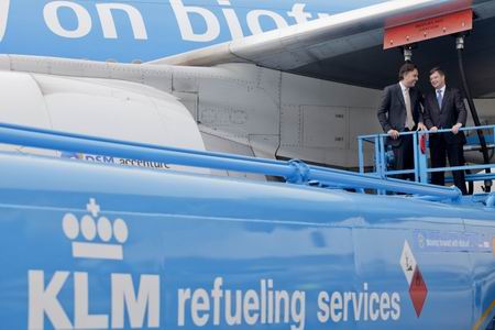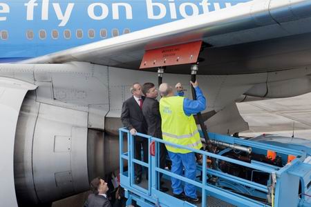 3月8日,在荷蘭阿姆斯特丹,荷蘭前首相巴爾克嫩德(中)參觀即將起飛的荷蘭皇家航空公司最新生物油燃料航班。