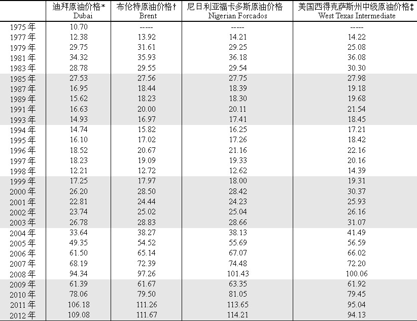 ‡1976-1983年公布的美國西得克薩斯州中級原油價格。1984-2012年美國西得克薩斯州中級原油(庫欣)現貨價格。