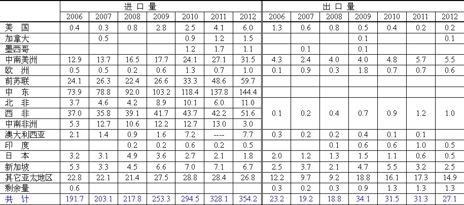 2006-2012年中國石油進出口量及來源(單位:百萬噸)