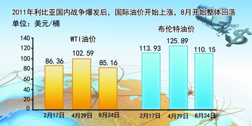 利比亞國內(nèi)戰(zhàn)爭2011年爆發(fā)后,國際油價開始上漲,并于4月底達(dá)到高點。5月5日,油價大跌10美元/桶左右,隨后維持震蕩走勢。2011年8月,油價開始整體回落。