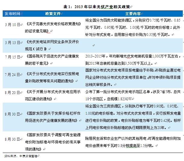 2013年8月31日,國家發改委出臺了《國家發改委關于發揮價格杠桿作用促進光伏產業健康發展的通知》和《國家發改委關于調整可再生能源電價附加標準與環保電價的有關事項的通知》,其中對光伏發電補貼機制進行了明確,并對可再生能源補貼的征收標準進行了調整。