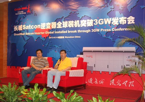 2013年9月3日,深圳市深航國際酒店深航廳人聲鼎沸,深圳中電長城能源有限公司(簡稱長城能源)"長城Satcon逆變器全球裝機(jī)量突破3GW"新聞發(fā)布會在這里隆重舉行。來自太陽能、電力等領(lǐng)域的專家、領(lǐng)導(dǎo)齊聚一堂,共同見證了這一歷史時刻。長城電腦總裁兼長城能源董事長、總裁周庚申等領(lǐng)導(dǎo)共同出席了此次發(fā)布儀式。