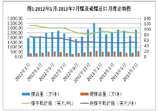 據(jù)海關(guān)信息網(wǎng)統(tǒng)計(jì),今年1-7月,我國(guó)進(jìn)口煤1.9億噸,增加14.1%;價(jià)值169.6億美元,下降4.6%;進(jìn)口平均價(jià)格為每噸90.7美元,下跌16.4%。