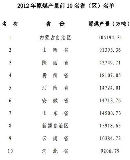 為促進煤炭工業健康可持續發展,加快煤炭產業結構調整,全面反映全國重點產煤省(區)、地(市)、縣(市)煤炭工業情況,9月23日,中國煤炭工業協會向全社會發布2012年前10名產煤省(區)、前100名產煤地(市)、前100名產煤縣(市)原煤產量。